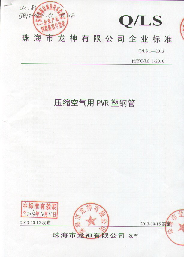 企業(yè)執(zhí)行標(biāo)準(zhǔn) 珠海市企業(yè)產(chǎn)品執(zhí)行標(biāo)準(zhǔn)證書 珠海市龍神有限公司企業(yè)執(zhí)行標(biāo)準(zhǔn) 壓縮空氣用PVR塑鋼管 2012-11-27 34790