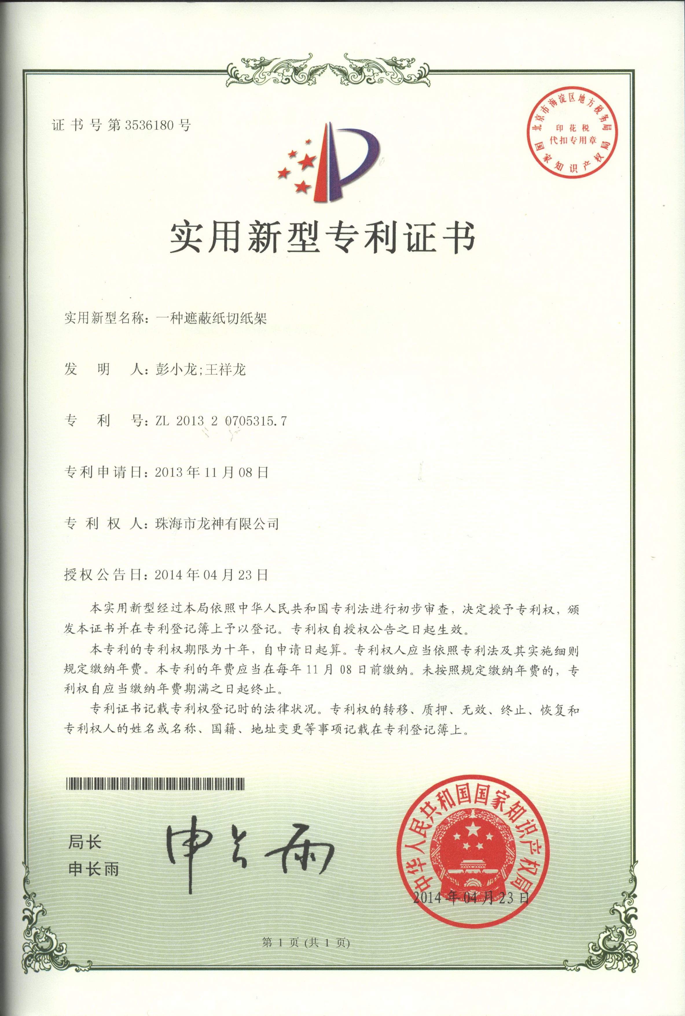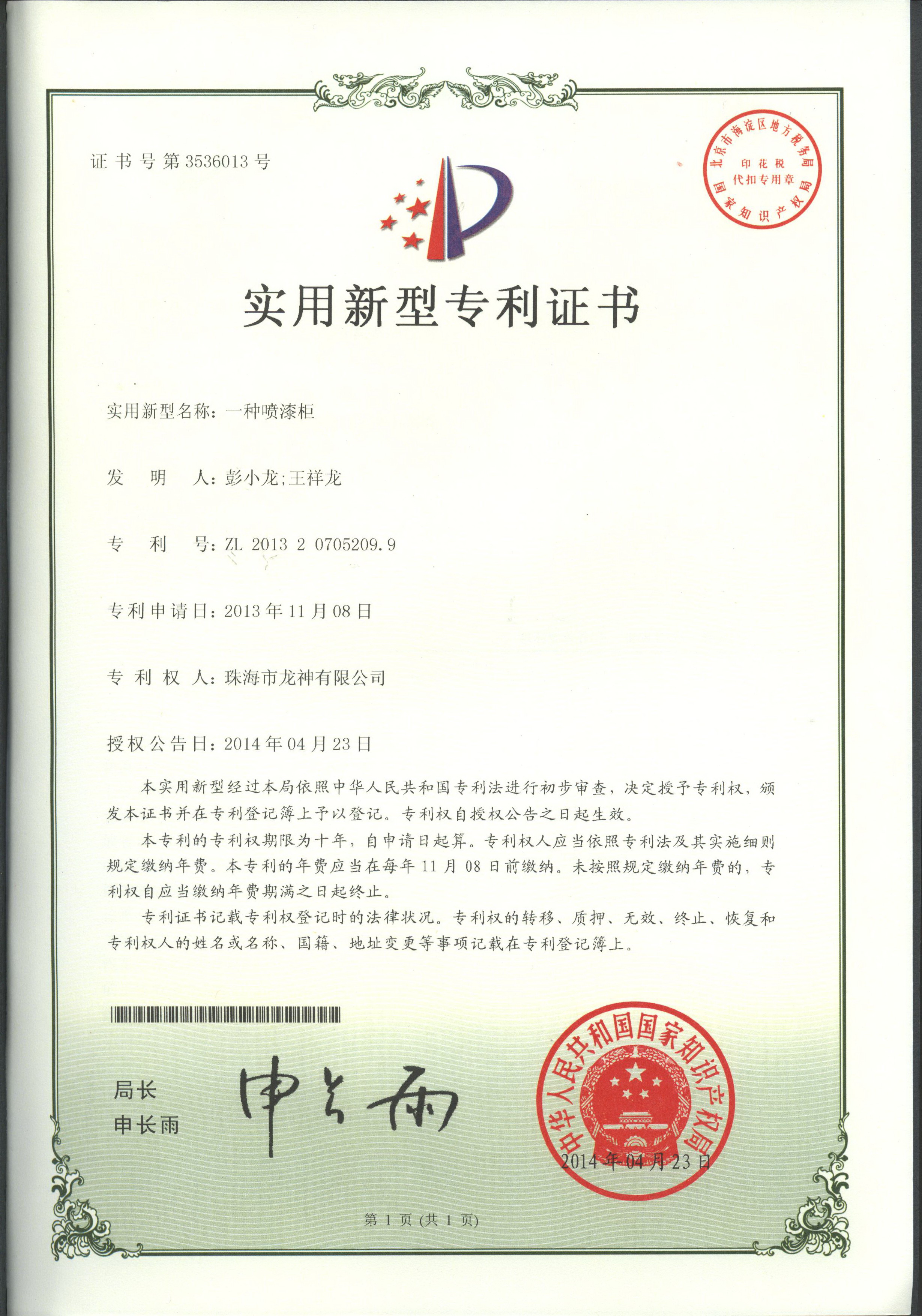企業(yè)榮譽(yù) 調(diào)漆裝置專(zhuān)利證書(shū) 噴漆柜專(zhuān)利證書(shū)遮蔽紙切紙架專(zhuān)利證書(shū) 塊型拉拔鉤專(zhuān)利證書(shū) 噴槍清洗機(jī)專(zhuān)利證書(shū)無(wú)靜電干燥加熱器專(zhuān)利證書(shū) 壓縮空氣空壓機(jī)房供應(yīng)系統(tǒng)專(zhuān)利證書(shū)除油劑導(dǎo)料器專(zhuān)利證書(shū)多功能?chē)姌屒逑礄C(jī) 環(huán)保自吸塵打磨系統(tǒng) 切膜裝置汽車(chē)保險(xiǎn)杠修復(fù)專(zhuān)用電烙鐵 精確可調(diào)整形架專(zhuān)利證書(shū) 移動(dòng)式無(wú)塵干磨專(zhuān)利證書(shū) 管道快速連接件專(zhuān)利證書(shū) 彭小龍總經(jīng)理證書(shū) 2012-11-27 30755