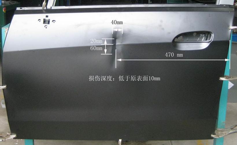 2013年車身修復大賽受損門板修復項目技術方案的補充說明 2013-05-16 18942 2013年車身修復大賽受損門板修復項目技術方案的補充說明 1、受損門板項目的受損位置及尺寸圖片、作業(yè)要求(1)作業(yè)要求在40分鐘內(nèi),對雪佛蘭新賽歐左前門外板上的長80mm,寬40mm,深10mm的條形凹陷(漆膜已破壞)進行修復,凹陷損傷穿過車身線。